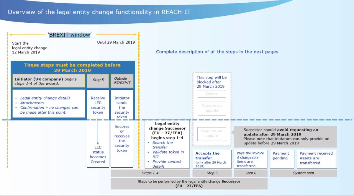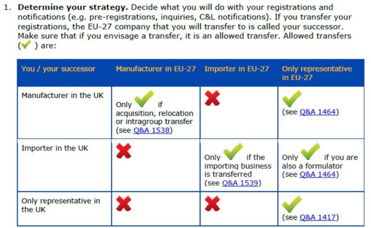 A noter que l'ECHA conseille actuellement de mettre en place un accord contractuel pour la nomination d'un OR au sein de l’EU-27, qui contient une clause suspensive conditionnelle stipulant que sa nomination prend effet à la date à laquelle le retrait du Royaume-Uni de l'UE prend effet. Cela permettrait aux déclarant britanniques de faire « marche arrière » en l’absence de Brexit, ou si les négociations évoluaient vers un « soft brexit ».