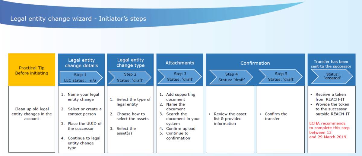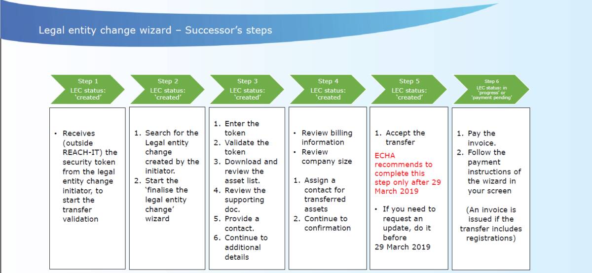 De nouvelles instructions sont maintenant disponibles sur le processus de transfert pas-à-pas. Voici une sélection d’infographies tirées du guide paru début février 2019 disponible sur le site de l’ECHA