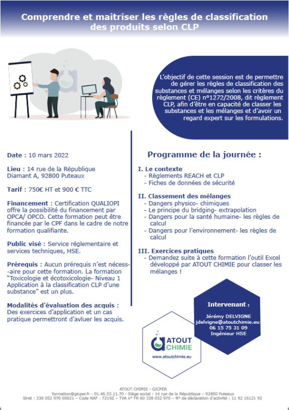 L’objectif de cette session est de maîtriser les règles de classification des substances et mélanges selon les critères du règlement (CE) n° 1272/2008, dit règlement CLP, afin d’être en capacité de classer les substances et les mélanges et d’avoir un regard expert sur les formulations.