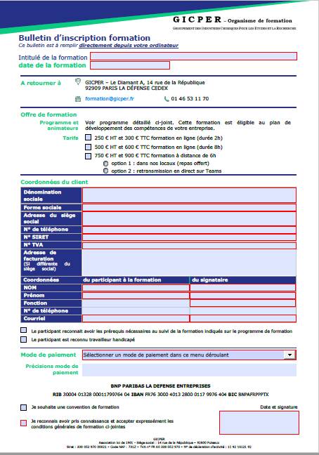 Téléchargez le bulletin d'inscription ci-dessous. Il est interactif, remplissez-le directement de votre ordinateur, signez-le électroniquement et renvoyez-le à formation@gicper.fr