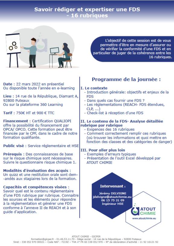 Après avoir passé en revue l’ensemble des aspects techniques et réglementaires, vous serez en mesure d’assurer ou de vérifier la conformité d’une FDS et en particulier de juger de la cohérence entre les 16 rubriques.