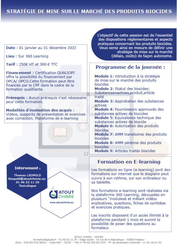 Cette formation pratique a pour but de vous permettre de vous présenter l'essentiel des dispositions réglementaires et aspects pratiques concernant les produits biocides. Vous serez ainsi en mesure de définir une stratégie de mise sur le marché (délais, coûts) de façon autonome.